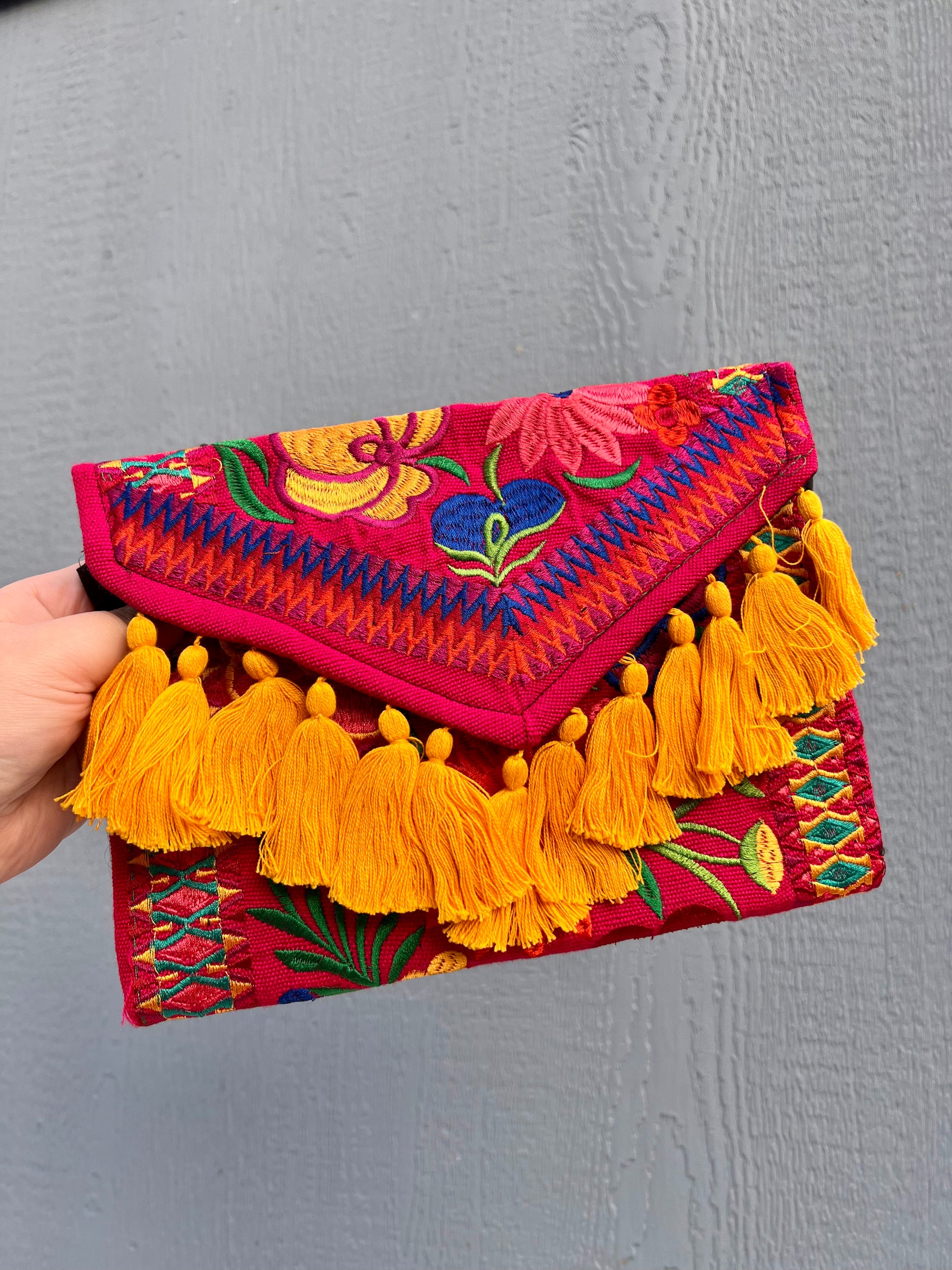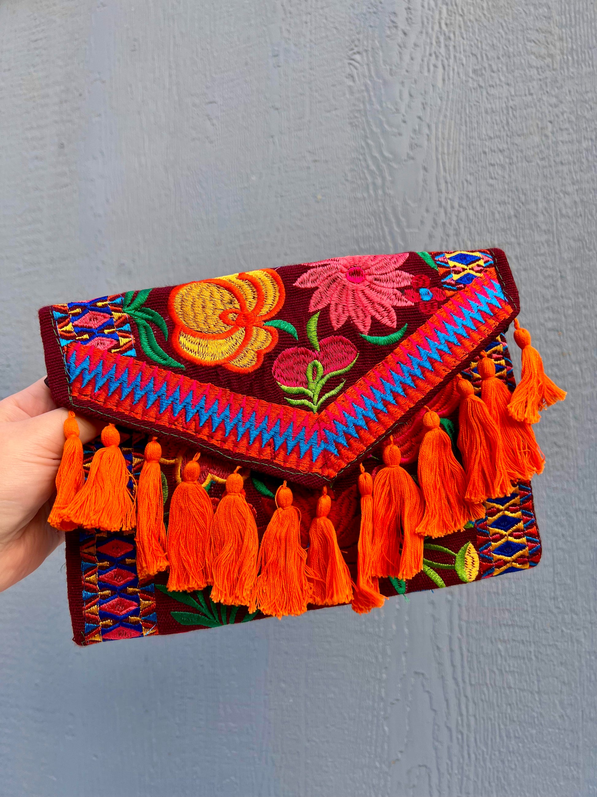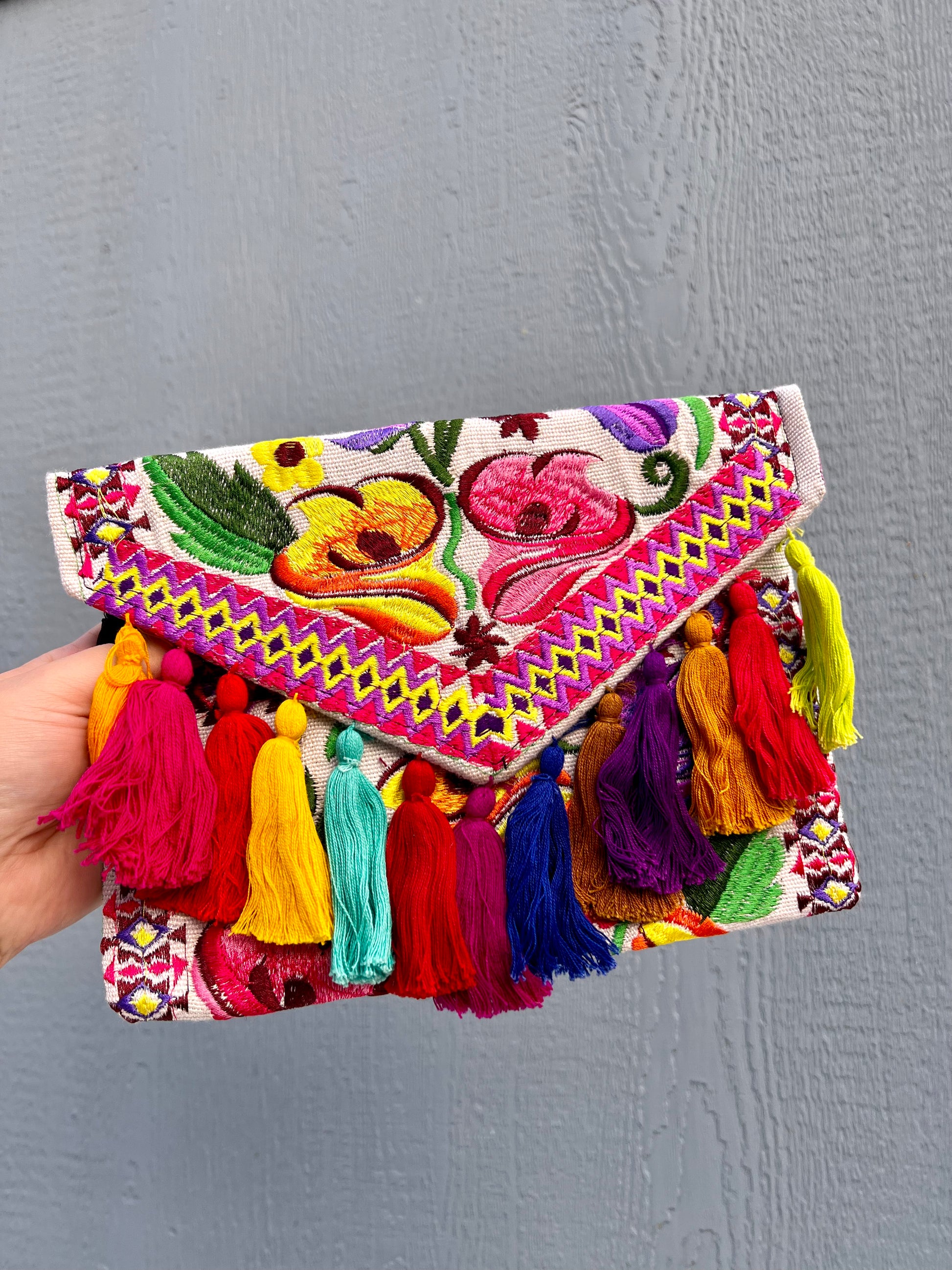 Beautiful handmade embroidered multicolor flower bag. Carefully detailed by skilled artisans in Chiapas, Mexico. This envelope styled crossbody bag is the perfect accessory for every day to show a pop of color.