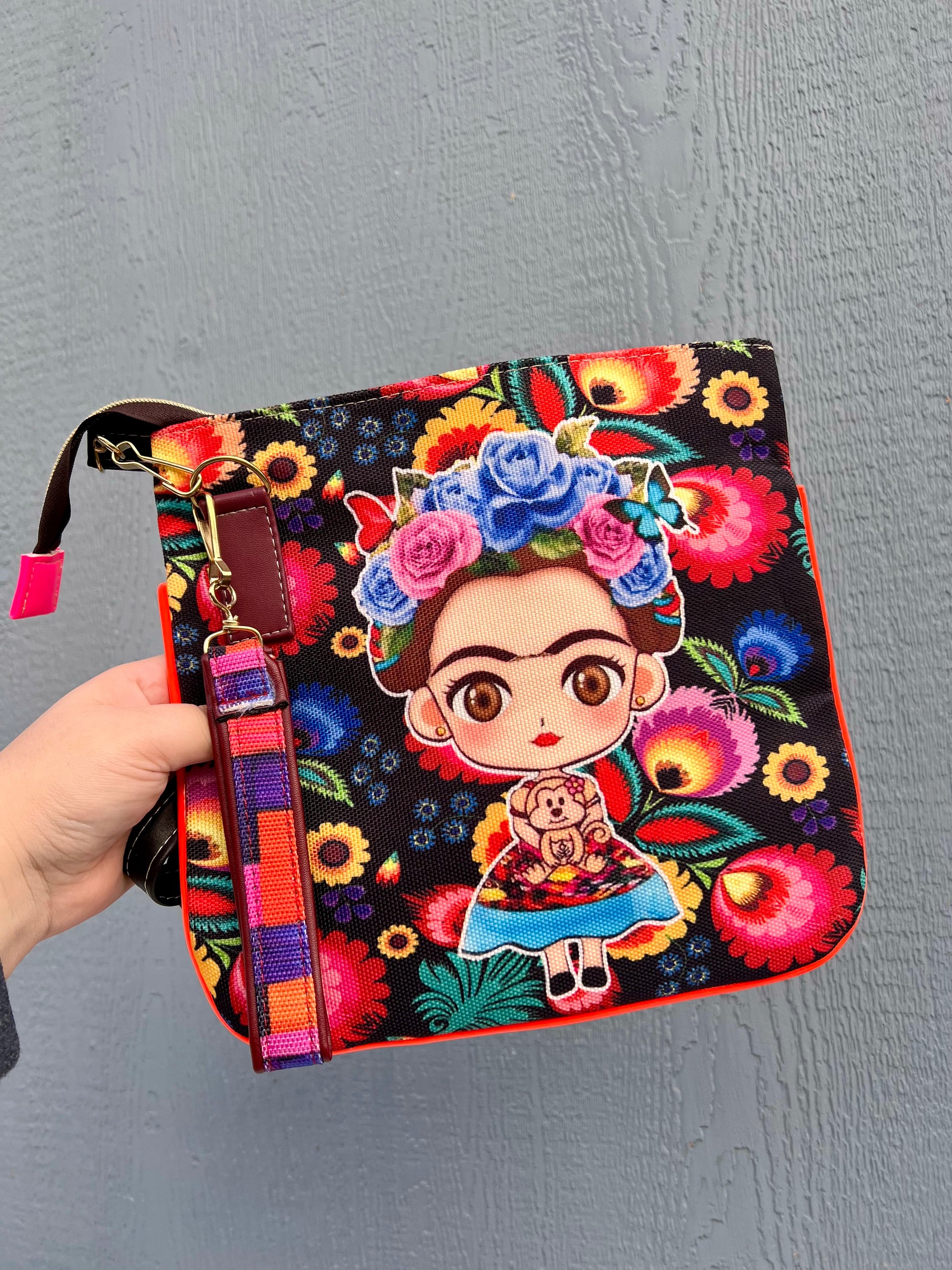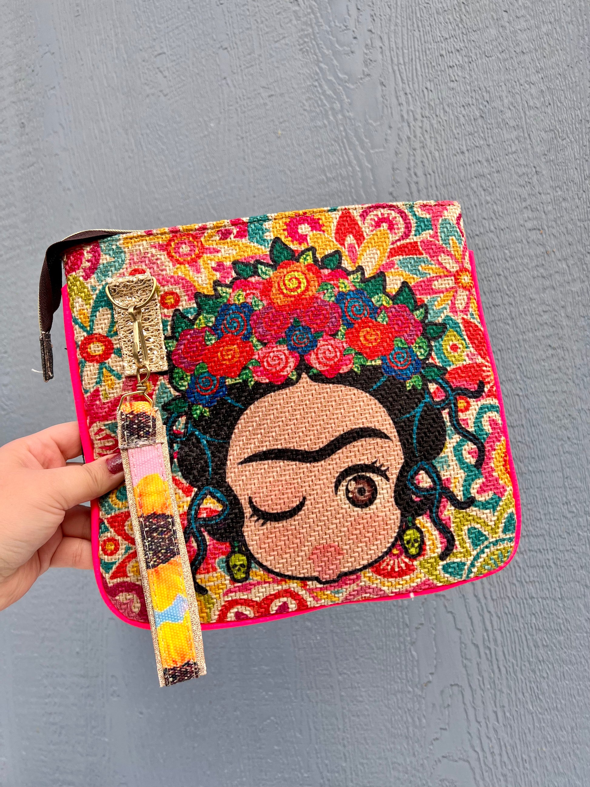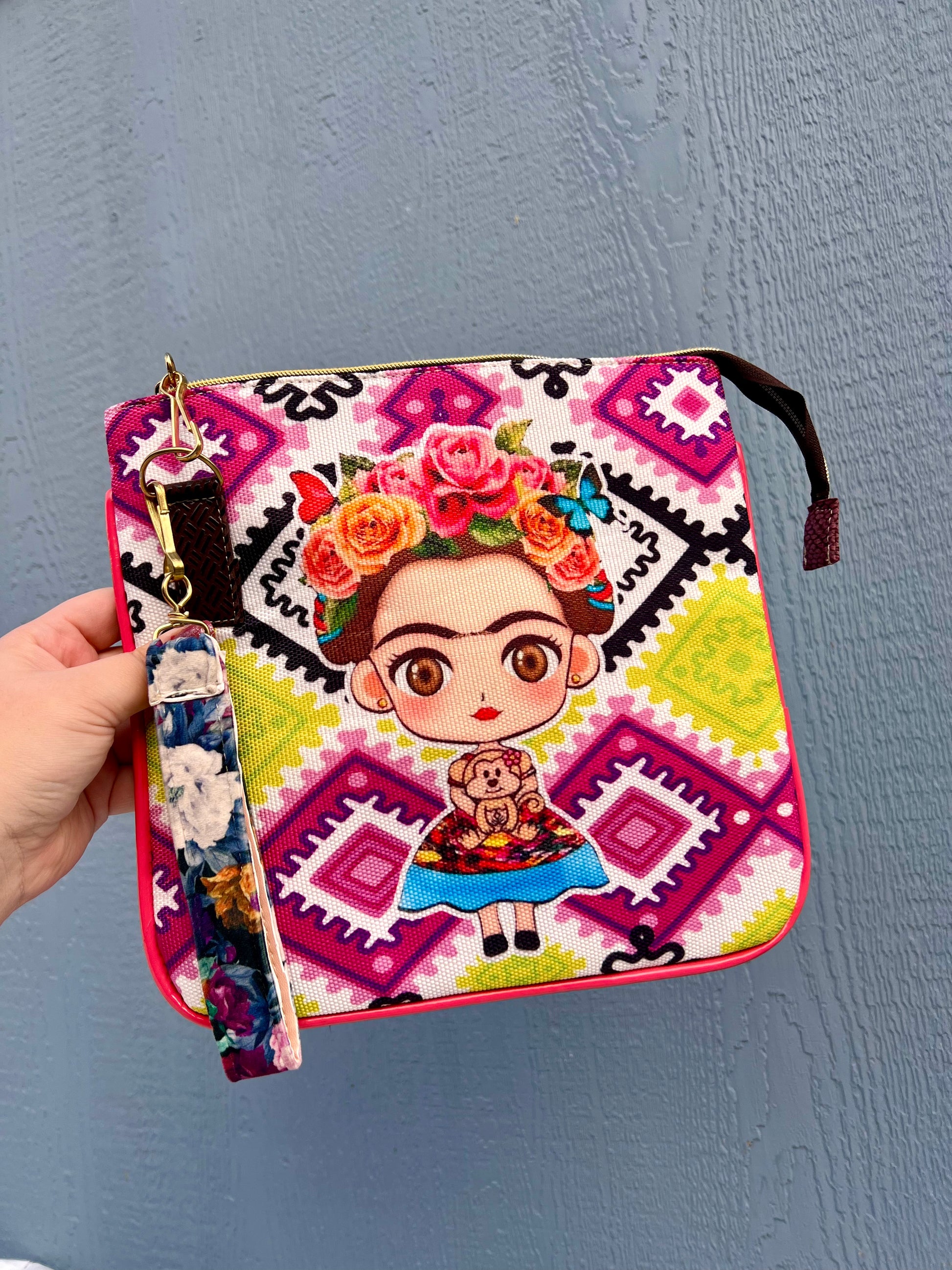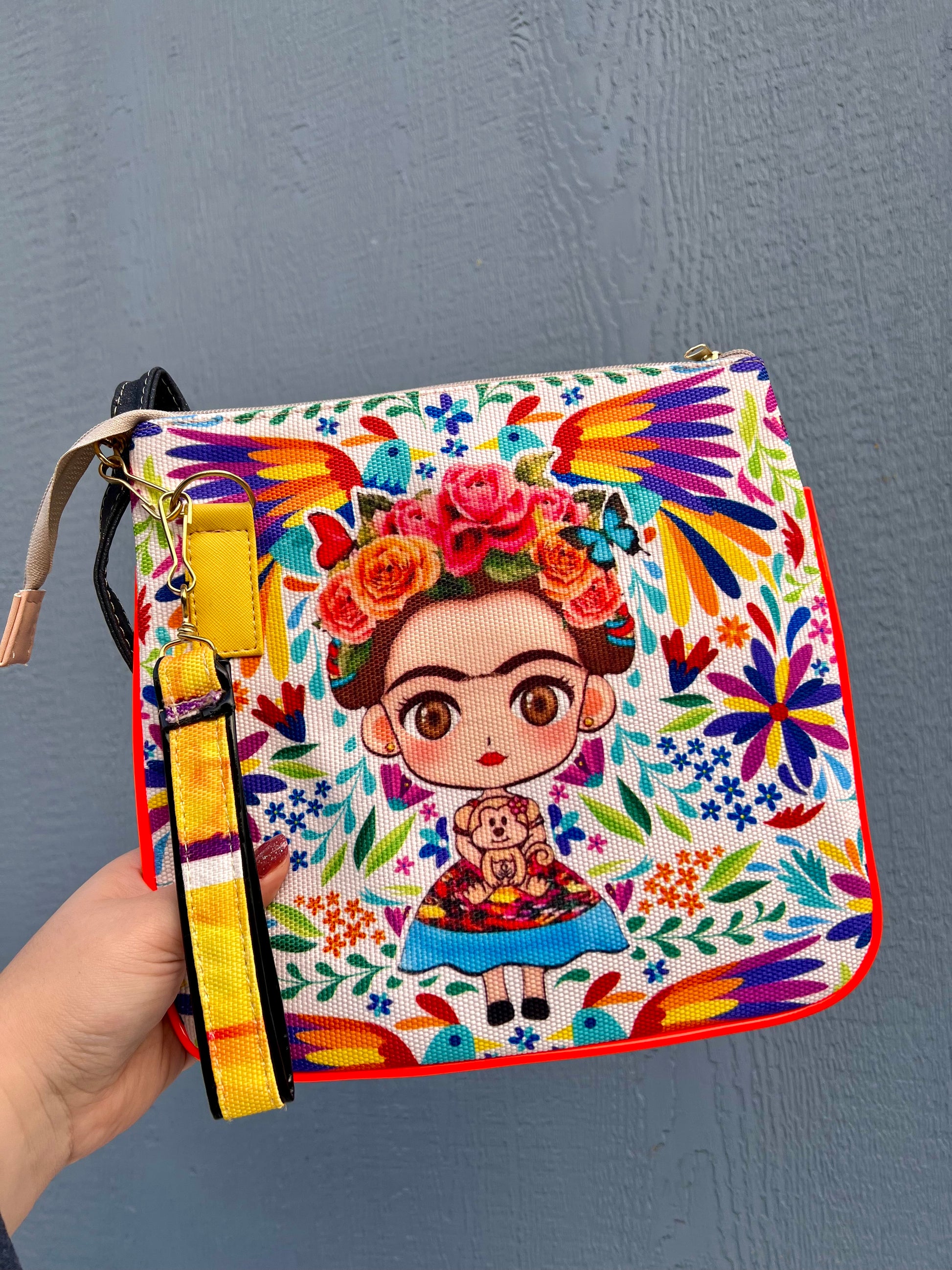 Frida colorful mini crossbody bags in different styles. Attached with a colorful wrist strap so you can transform your bag into a wristlet bag.